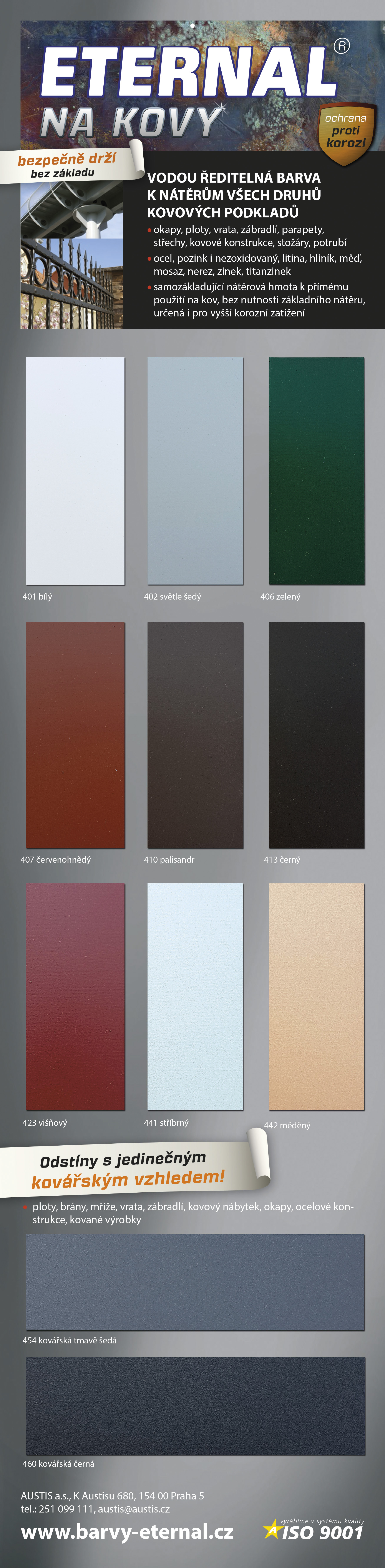 ETERNAL na kovy je matná, samozákladující nátěrová hmota k přímému použití na kovové podklady. Vyznačuje se vysokou adhezí na kovových podkladech a to i na zinku, titanzinku, lehkých kovech a antikorozních ocelích, zvýšenou ochranou proti korozi, vysokou odolností UV záření a povětrnostním vlivům. Je určen pro základní i vrchní nátěry kovových konstrukcí, stožárů, vnějších povrchů nádrží, potrubí, plotů, zábradlí, plechové krytiny, trubek, plechů, a dalších kovových výrobků z oceli, litiny, zinku, antikorozních ocelí, hliníku, mědi, mosazi i v prostředí s vyšším korozním zatížením.